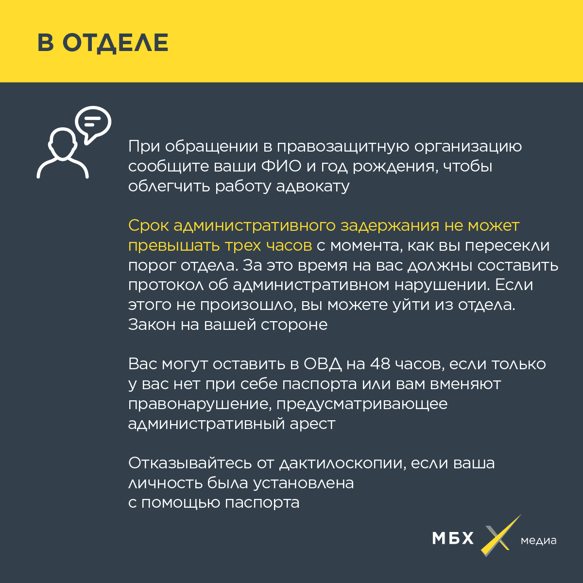 Памятка о том, как себя вести, если после митинга вызвали в полицию, следственный комитет или пришли с обыском (очень. Адвокат мария эйсмонт о статье 212.1 ук. Эта памятка будет регулярно обновляться в связи с новыми прецедентами, кейсами и возможными ситуациями при задержании. От того, насколько грамотно человек действует в момент задержания, может зависеть его дальнейшая судьба. Картинки по запросу овд инфо памятка Главное о предстоящих протестах в 63 российских городах — и памятка. Во время протестных акций мы стараемся поддержать как можно больше людей. Информация защищает ⠀ сообщить о задержании или задать вопрос: Посмотрите короткую версию нашей инструкции идеального задержанного!инструкция полезна как тем, кто еще никогда не о. Юристы апологии протеста советуют в объяснениях или протоколах написать фактическое время задержания (когда отвели в автозак). Собираетесь участвовать в уличной акции? Сохраните и распечатайте нашу новую памятку, лучше в нескольких экземплярах. ☎️ 88007070528 | tg @ovdinfobot donate.ovdinfo.org памятка.